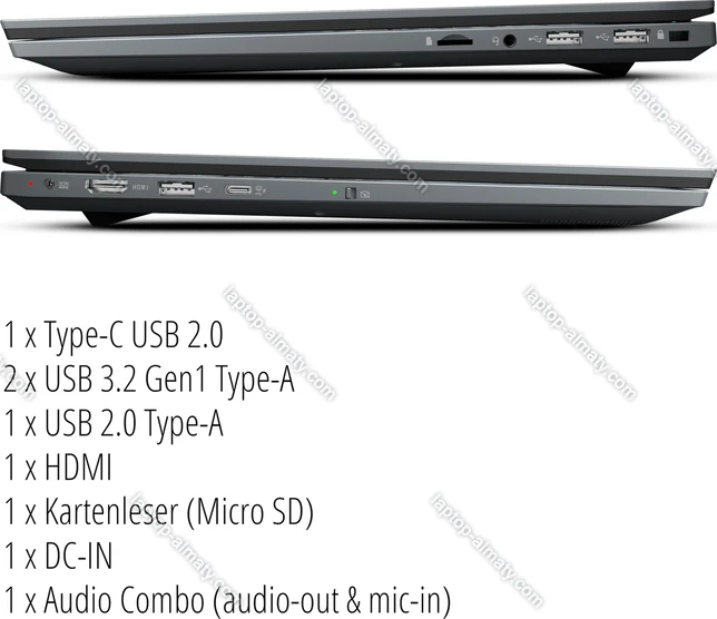 - 1x USB-C 2.0 (480Mb/s), 2x USB-A 3.0 (5Gb/s), 1x USB-A 2.0 (480Mb/s), 1x HDMI, 1x 3.5 мм аудио-разъём, 1x microSD, 1x DC-In разъём питания