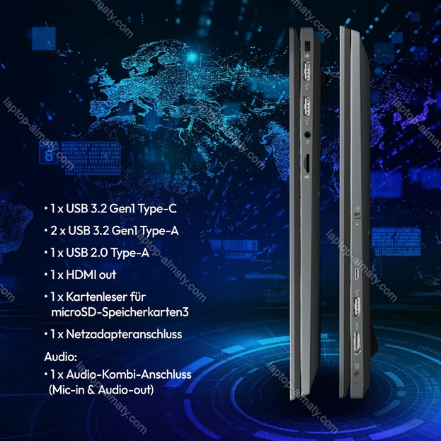 - 1x USB-C 3.0 (5Gb/s), 2x USB-A 3.0 (5Gb/s), 1x USB-A 2.0 (480Mb/s), 1x HDMI, 1x 3.5 мм аудио-разъём, 1x microSD, 1x DC-In разъём питания